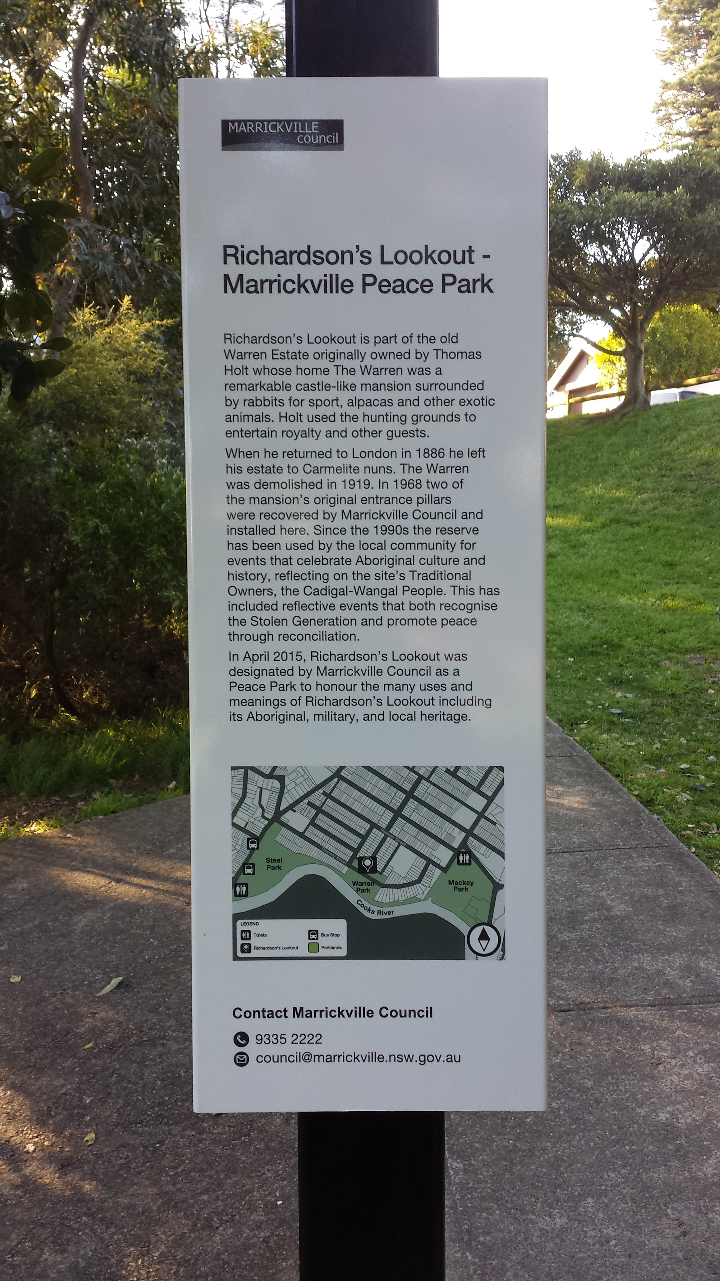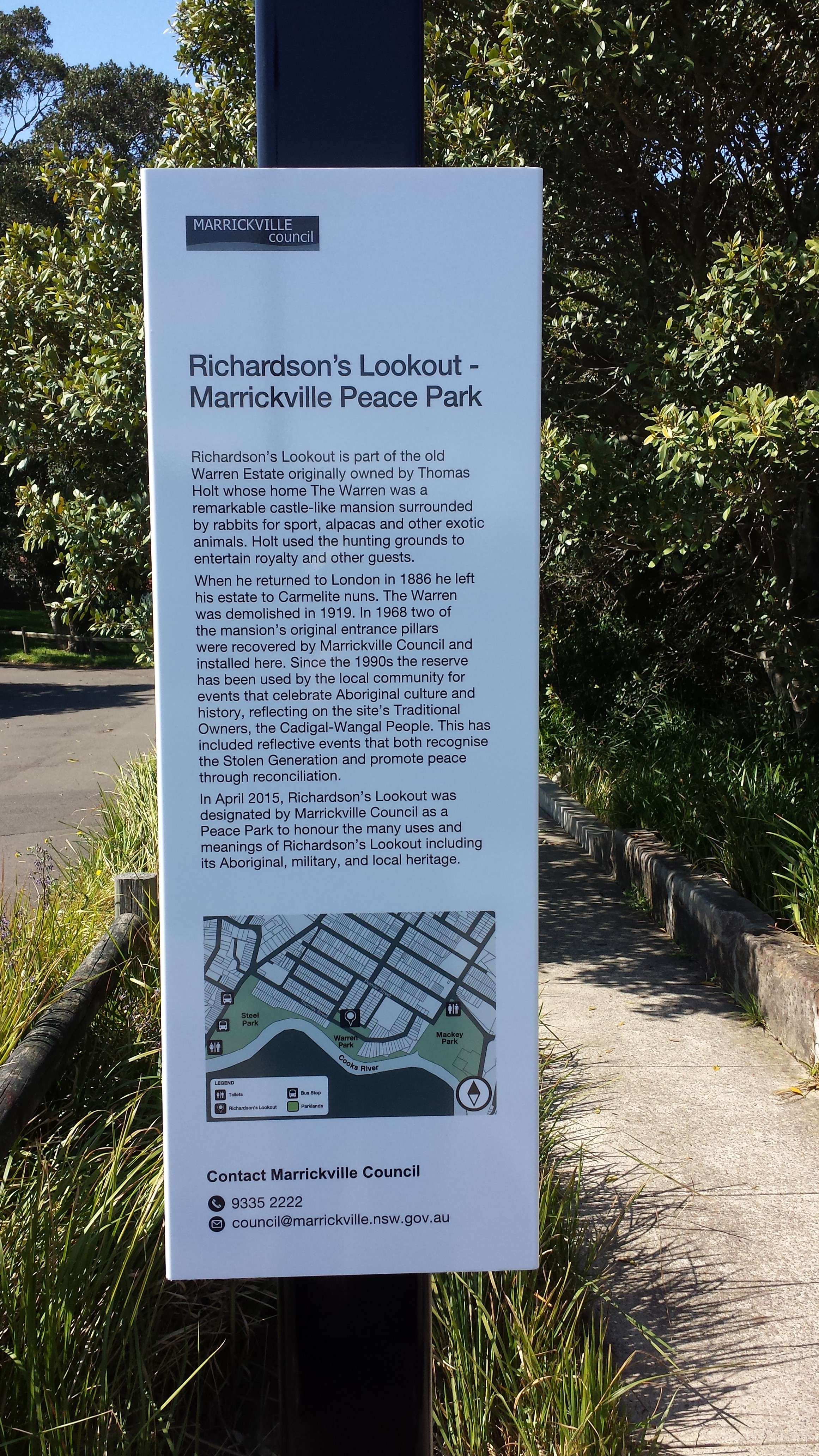 Congratulations to Marrickville Council for recently installing new signage in Richardson’s Lookout – Marrickville Peace Park. Refer to the photos of the signage below.